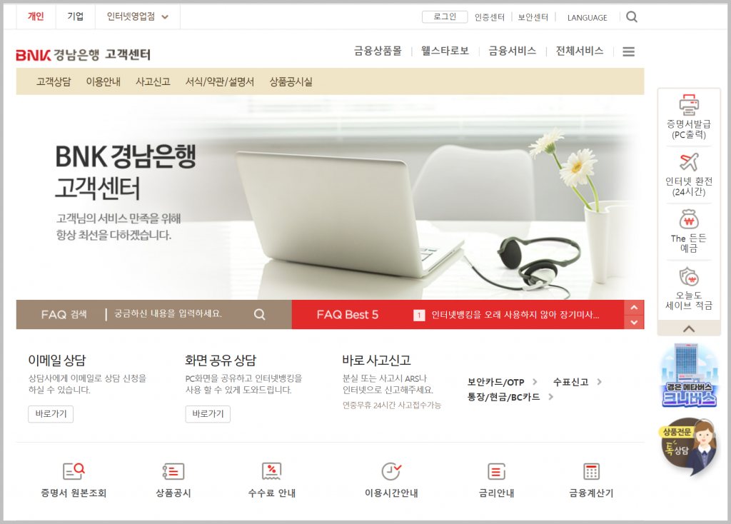 경남은행(BNK)에서 제공하는 많은 서비스는 지점 방문 없이 온라인에서도 처리할 수 있습니다. 따라서 이번 포스팅에서는 고객센터를 이용하는 방법에 대해 알아보도록 하겠습니다. 우선 홈페이지에 접속하여 필요한 정보를 확인할 수 있습니다.