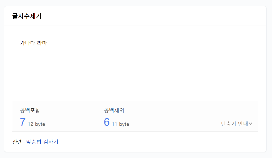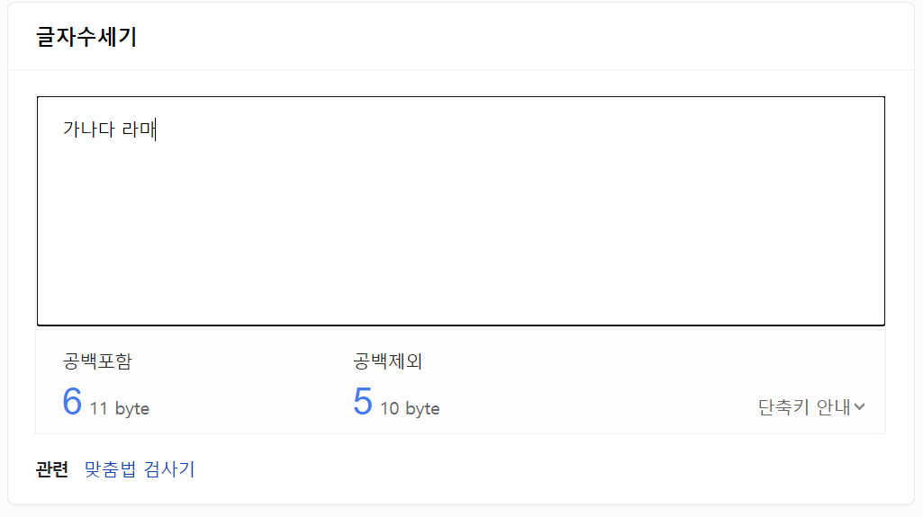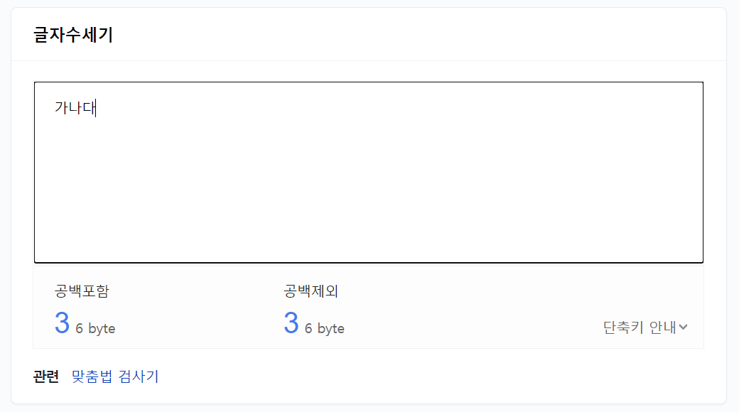'가나다'와 같이 단어를 입력하면 세 글자가 된다고 바로 알려주며, 바이트 수도 함께 보여줍니다.