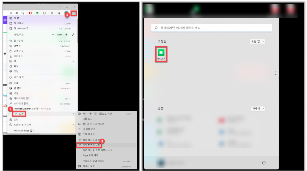 두 번째는 시작 화면에 고정하기가있습니다. 우측 상단에 있는 메뉴를 클릭한 후, 기타 도구 -> 시작 화면에 고정을 선택하면 시작 메뉴에 아이콘이 나타납니다. 이 방법으로도 간단하게 바로가기를 만들 수 있습니다.