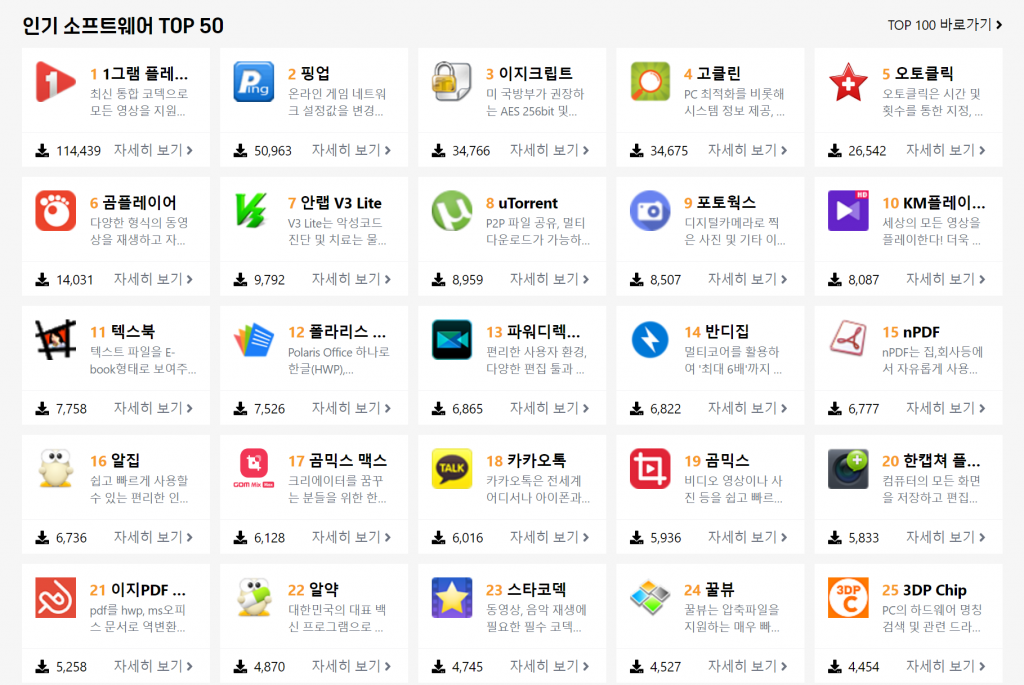 메인 화면에서 자료실을 들어가면 다운로드 TOP이라고 표시되어 있습니다. 많은 사람들이 다운로드하는 소프트웨어 순위로 정렬하여 제공하고 있습니다. 필요한 프로그램을 차례로 확인하고 다운로드하면 됩니다.