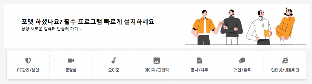 특히, PC 포맷 후 필수 S/W 카테고리를 찾아보면 많은 가치 있는 프로그램들이 있습니다. 각각의 카테고리에서 원하는 필수 프로그램을 선택하여 설치할 수 있도록 잘 정리되어 있습니다. 포맷 후 재설치해야 할 때 해당 카테고리에서 원하는 것을 하나씩 선택하여 설치하면 됩니다.
