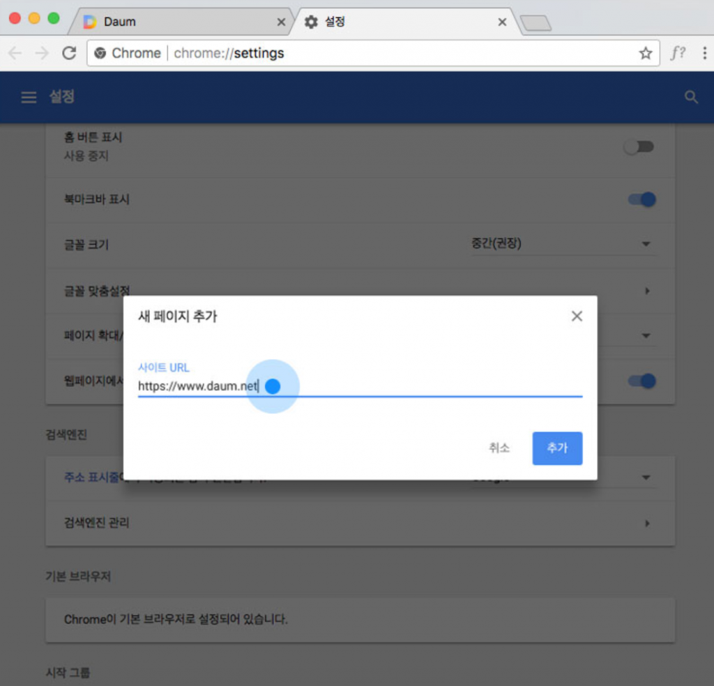 대중적으로 많이 사용하는 크롬의 경우, 설정 메뉴로 이동한 후 "새 탭 추가"에서 설정할 수 있습니다. 거기에 www.daum.net을 입력하면 됩니다. 더 자세한 내용은 "다음을 시작 페이지로" 페이지를 참고하시면 됩니다. 브라우저마다 조금씩 다르기 때문에 여기에 모두 설명하기는 조금 어려운 것 같아요.