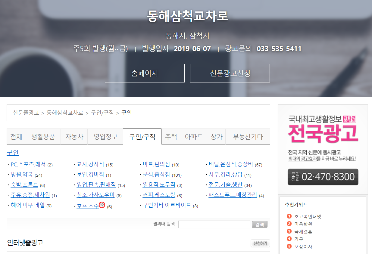 해당 링크로 들어가시면 동해삼척교차로에서 제공하는 다양한 광고를 인터넷에서 쉽게 찾아볼 수 있습니다. 종이 신문에서 면을 넘기며 찾아야 할 정보를 업종별로 간편하게 검색할 수 있어 편리합니다.