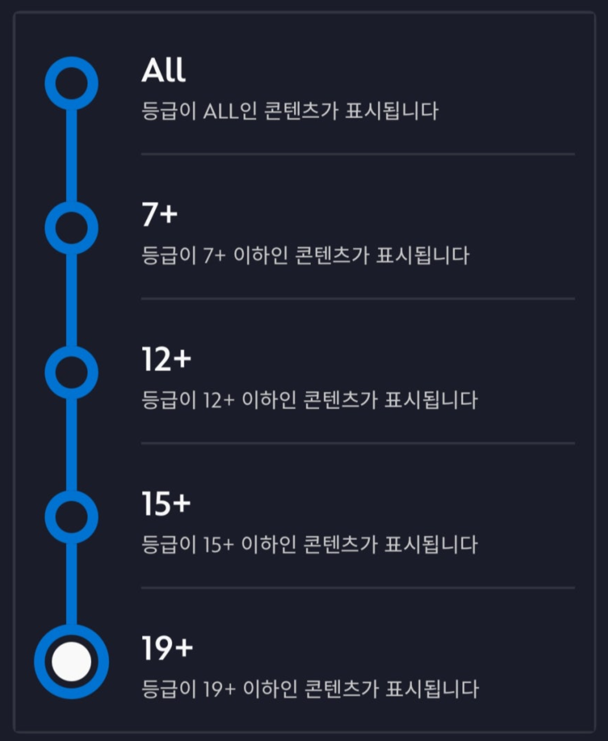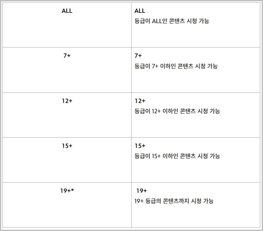 이러한 과정을 마친 뒤에는 각 프로필 설정에서 시청제한 등급을 19+로 변경해야 합니다. 설정은 프로필 수정 메뉴의 ‘콘텐츠 등급’ 항목에서 비밀번호 입력 후 변경 가능합니다.