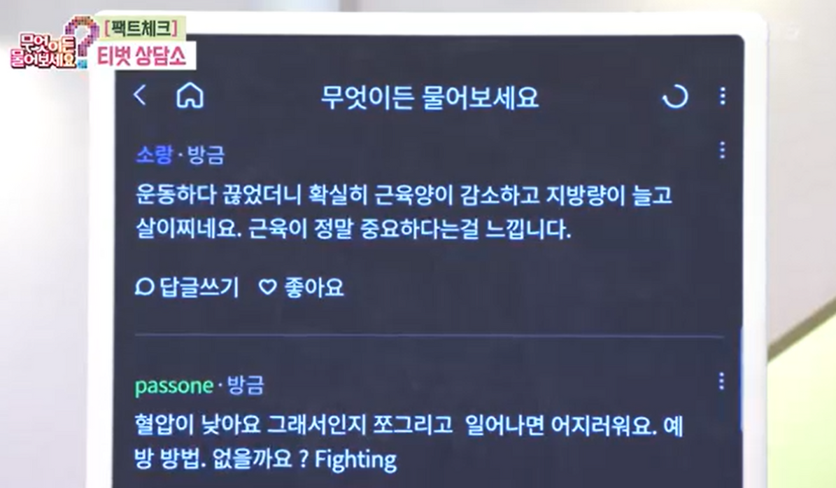 티벗은 단순히 퀴즈 참여를 넘어, 방송 중에 실시간으로 출연진에게 질문을 보내거나 의견을 개진할 수 있는 소통 창구 역할을 하고 있습니다. '무엇이든 물어보세요'의 생방송이라는 강점을 십분 활용하여 시청자와 제작진이 쌍방향으로 교류하는 모습이 인상적이었습니다. 마치 온 가족이 둘러앉아 TV를 보며 이야기 나누는 것처럼, 출연진의 답변에 실시간으로 '좋아요'를 누르거나 관련 질문을 올리면서 참여하는 재미가 쏠쏠했습니다. 특히 중학생인 큰딸아이와 초등학생인 작은딸아이의 교육에 관심이 많은 저에게는, 전문가들의 조언을 실시간으로 들으면서 궁금한 점을 바로바로 물어볼 수 있다는 점이 큰 매력으로 다가왔습니다.