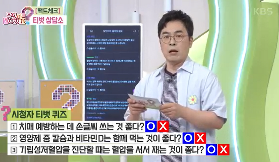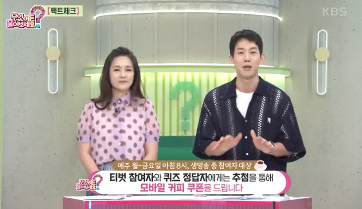 그날 아침, 딸아이의 호기심 덕분에 저는 난생 처음으로 '무엇이든 물어보세요'를 제대로 시청하게 되었습니다. 그런데 놀랍게도 화면 한쪽에는 '티벗 참여자와 퀴즈 정답자에게 추첨을 통해 모바일 커피 쿠폰을 드립니다'라는 문구가 떠 있었죠. 한때는 '아침마당'에서 ARS로 퀴즈를 맞추던 게 전부였던 것 같은데, 이제는 KBS의 간판 아침 교양 프로그램인 '무엇이든 물어보세요'도 모바일 앱을 통한 시청자 참여를 적극적으로 유도하고 있다는 사실에 신선한 충격을 받았습니다.
