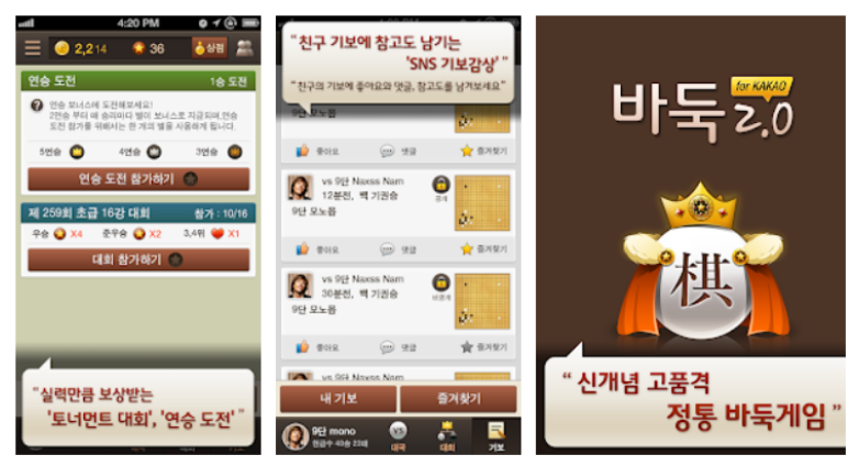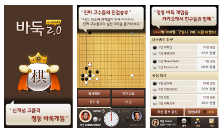 바둑을 즐길 수 있는 앱은 다양한데, 여기서는 '바둑2.0' 앱을 추천해드립니다. 이 어플은 게임 개발사 모노몹이 만든 안드로이드용 앱입니다. 이 앱은 카카오톡과 연동이 되는 점이 특징입니다.