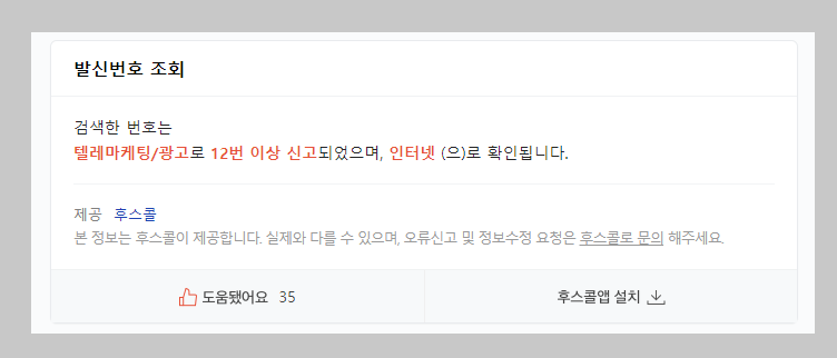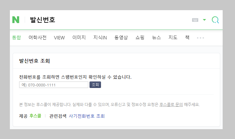다양한 페이지 중 첫 번째로 소개할 곳은 후스콜입니다. 이곳은 네이버와 연계하여 서비스를 제공하는 업체입니다. 네이버에서 간단히 '발신번호'라고 치면 후스콜에서 제공하는 SPAM 조회 서비스를 이용할 수 있습니다.