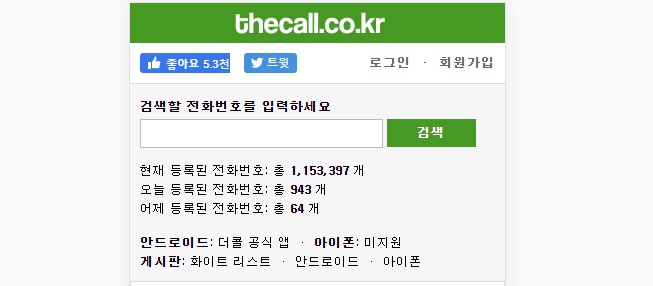 매일 수백 건의 전번이 등록되고 있는 더콜의 데이터베이스에는 백만 개 이상의 스팸이 저장되어 있습니다. 더콜 홈페이지로 간단히 접속하려면 아래 링크를 통해 접속할 수 있습니다. 주소는 thecall.co.kr입니다.