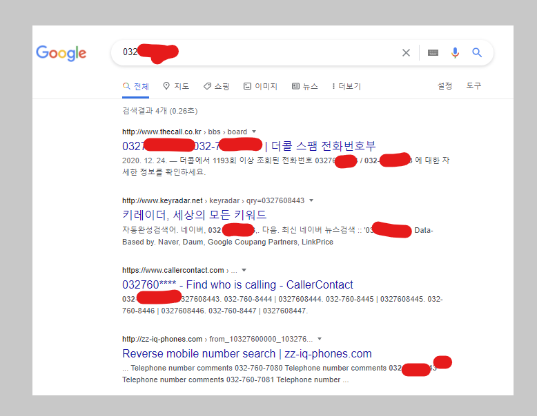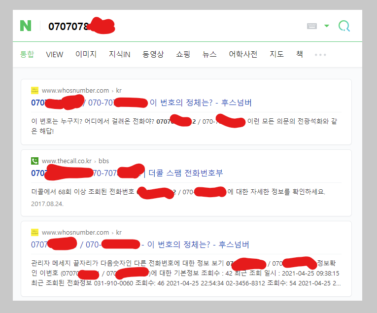 제가 스팸과 관련된 페이지를 여러 개 이용해보았지만, 결국 가장 좋은 결과를 얻은 것은 구글에서 서칭하는 것입니다. 구글에서 서칭하면 해당 넘버가 피싱인지 아닌지 즉시 알 수 있습니다. 구글에서 하면 다양한 홈페이지의 데이터베이스를 모두 활용할 수 있습니다.