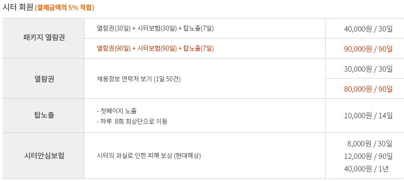 하루에 50건 정도만 채용정보를 볼 수 있기 때문에 무료등록만으로는 볼 수 있는 것이 한정적 입니다. 따라서 더 빨리 구하고 싶거나 원하는 채용자에게 먼저 연락을 하고 싶다면 유료서비스를 이용해야합니다. 바로 열람권을 구매하는 것 입니다. 위 표를 통해 자세한 금액을 확인할 수 있습니다.
