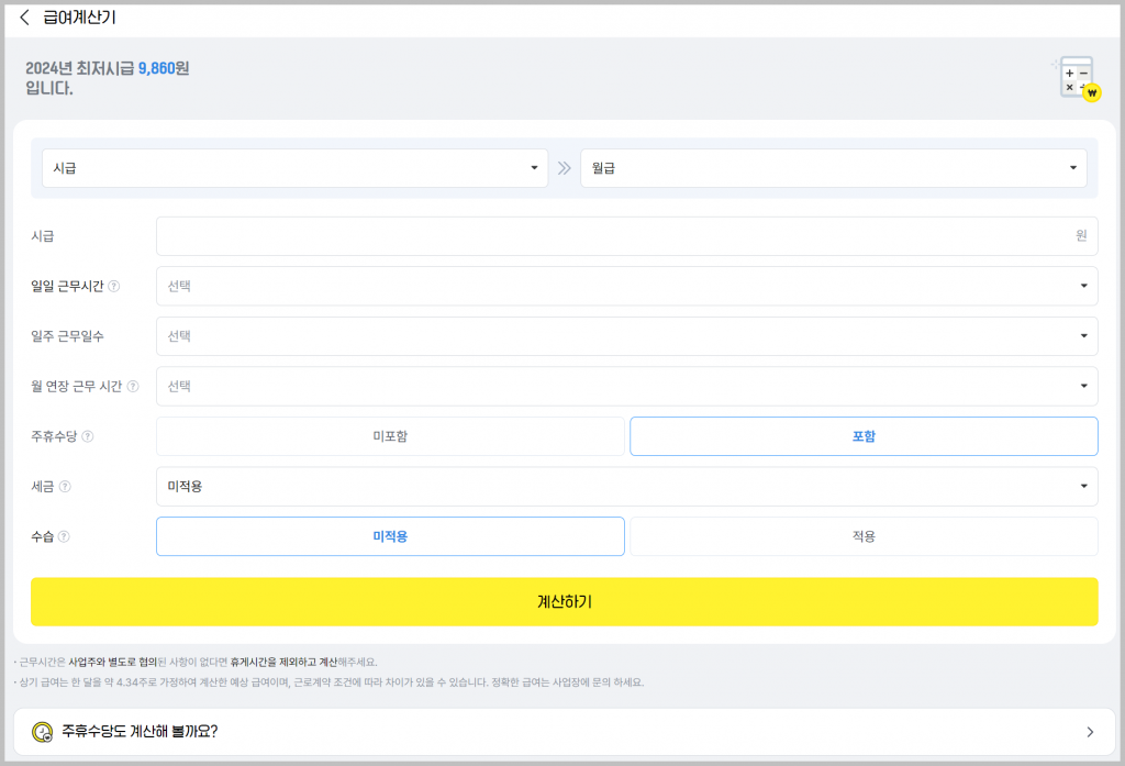 또한 위 링크를 통해 급여계산기를 이용할 수도 있습니다. 근무시간이나 근무 일수, 세금 여부까지 한꺼번에 정산이 가능하니 이를 이용하는 것을 추천합니다. 저 역시도 자주 사용하고 있습니다. 이러한 서비스는 스마트폰으로 접속해도 깔끔하게 사용할 수 있습니다.