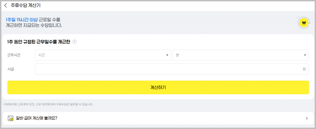 이 산정 방법은 간단해 보이지만, 1주일 동안 일한 시간의 변동폭이 큰 경우 손으로 정산하기가 쉽지 않습니다. 그래서 알바천국 주휴수당 계산기를 쓰면 편리합니다.