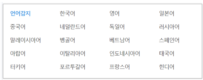 카카오에서 지원하는 언어는 모두 24가지입니다. 이는 한국어에서만이 아니라 "영어 -> 일본어" 처럼 다양한 언어 조합을 지원합니다. 이러한 기능은 아마도 한국어를 중간 매개로 사용하는 것이 아닐까 추측됩니다.