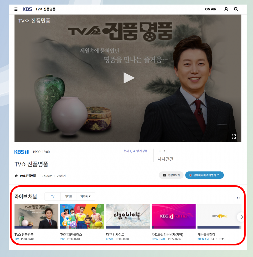 홈페이지로 들어가면 가장 먼저 볼 수 있는 것은 KBS1 TV의 화면입니다. 대표 채널이기 때문에 가장 위에 나오게 됩니다. 제가 들어갔을 때는 진품명품이 방영되고 있었습니다.