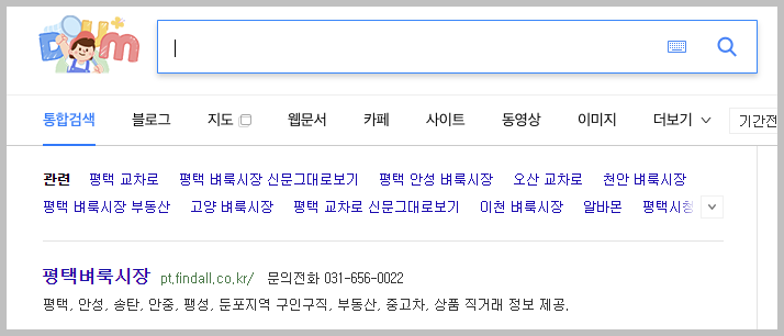 '평택벼룩시장'을 검색해보면, 다음 검색창에서는 물론, 네이버 같은 다른 포털 사이트에서도 해당 홈페이지가 맨 위에 노출됩니다. 이렇게 대부분의 포털 사이트에서 쉽게 평택벼룩시장의 홈페이지를 찾을 수 있습니다.