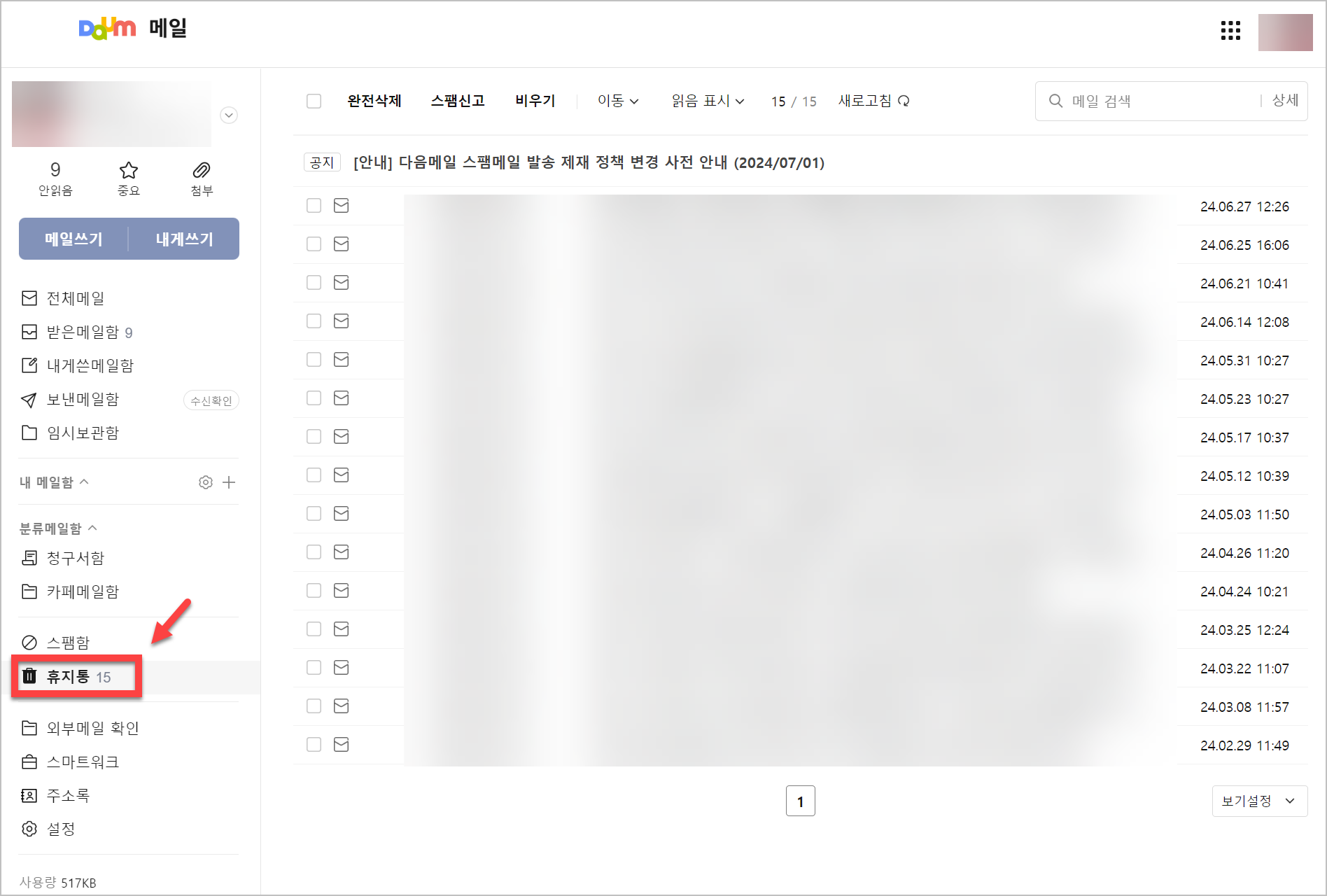 위 화면은 다음Mail을 컴퓨터에서 들어갔을때의 모습입니다. 이곳에 보면 왼쪽 아래에 '휴지통'이라고 되어 있지요. 이것을 클릭을 하면 지금까지 삭제했던 파일을 확인할수 있습니다.