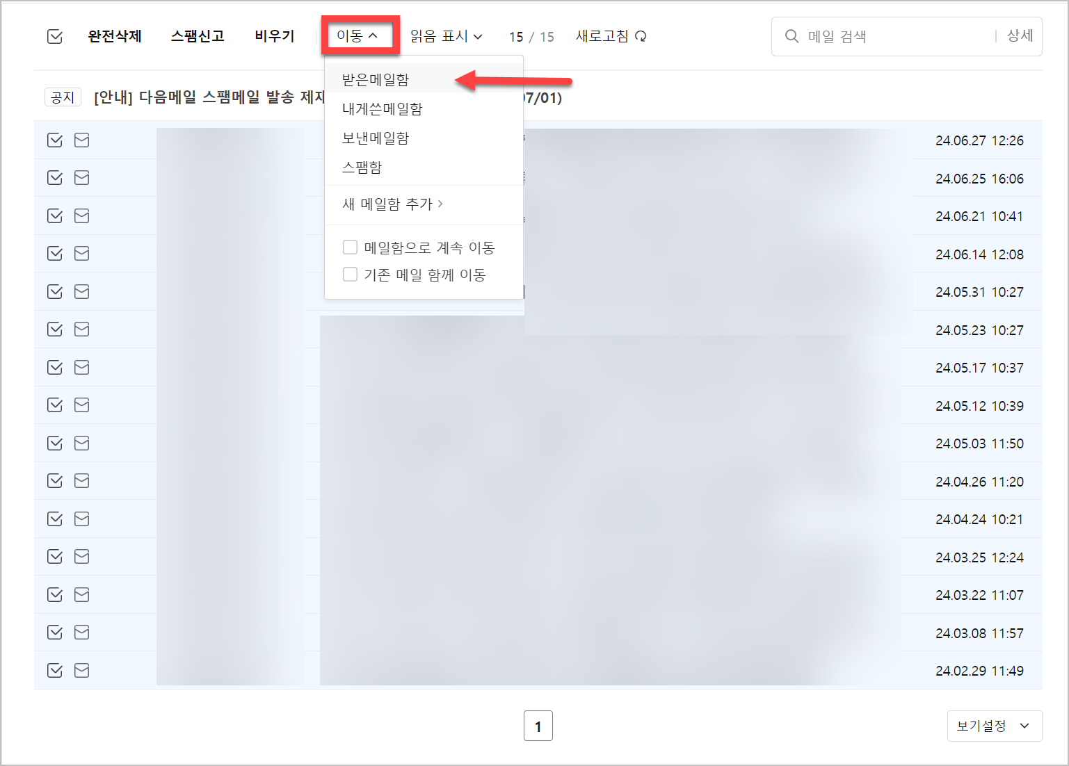 원하는 메일을 선택한 다음에 '이동'을 클릭을 하고 이동할 편지함을 선택해주면 간단하게 복원 및 복구가 진행되는 시스템입니다. 혹시나 완전삭제를 누르신다면 돌이킬수 없는 삭제가 진행되기 때문에 절대로 눌러서는 안됩니다.